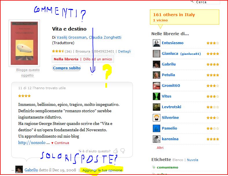 Insomma se andiamo a vedere i commenti relativi a un certo libro, scritti da altri utenti, non possiamo da lì inserire il nostro commento, ma solo rispondere (feedback) a un altro commento.